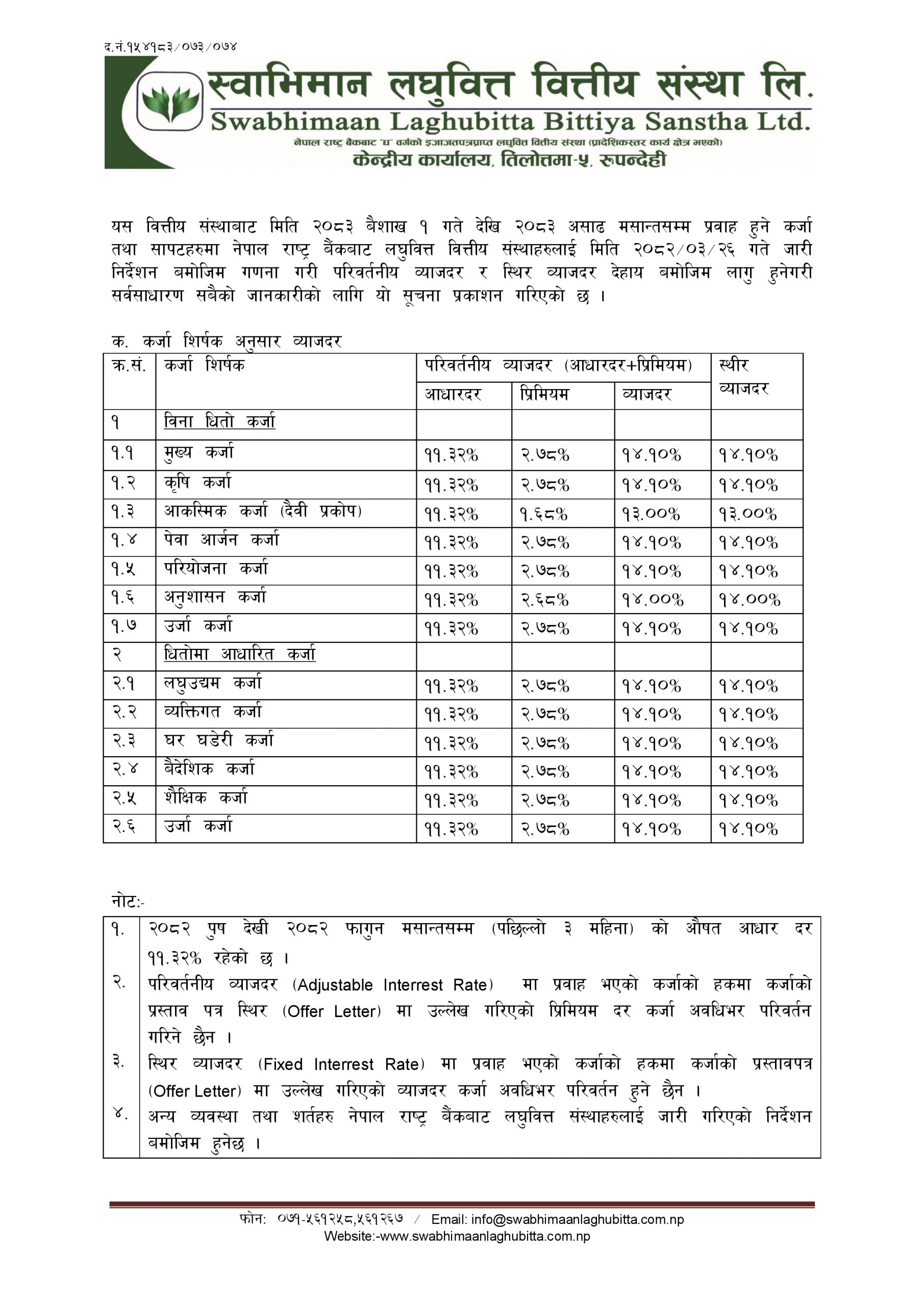 काठमाडौं : स्वाभिमान लघुवित्त वित्तीय संस्थाले २०% बोनस सेयर सम्बन्धित सेयरधनीको डिम्याट खातामा जम्मा गरिदिएको छ । कम्पनीले गत माघ २९ गतेसम्म सेयर डिम्याट गरा ...
